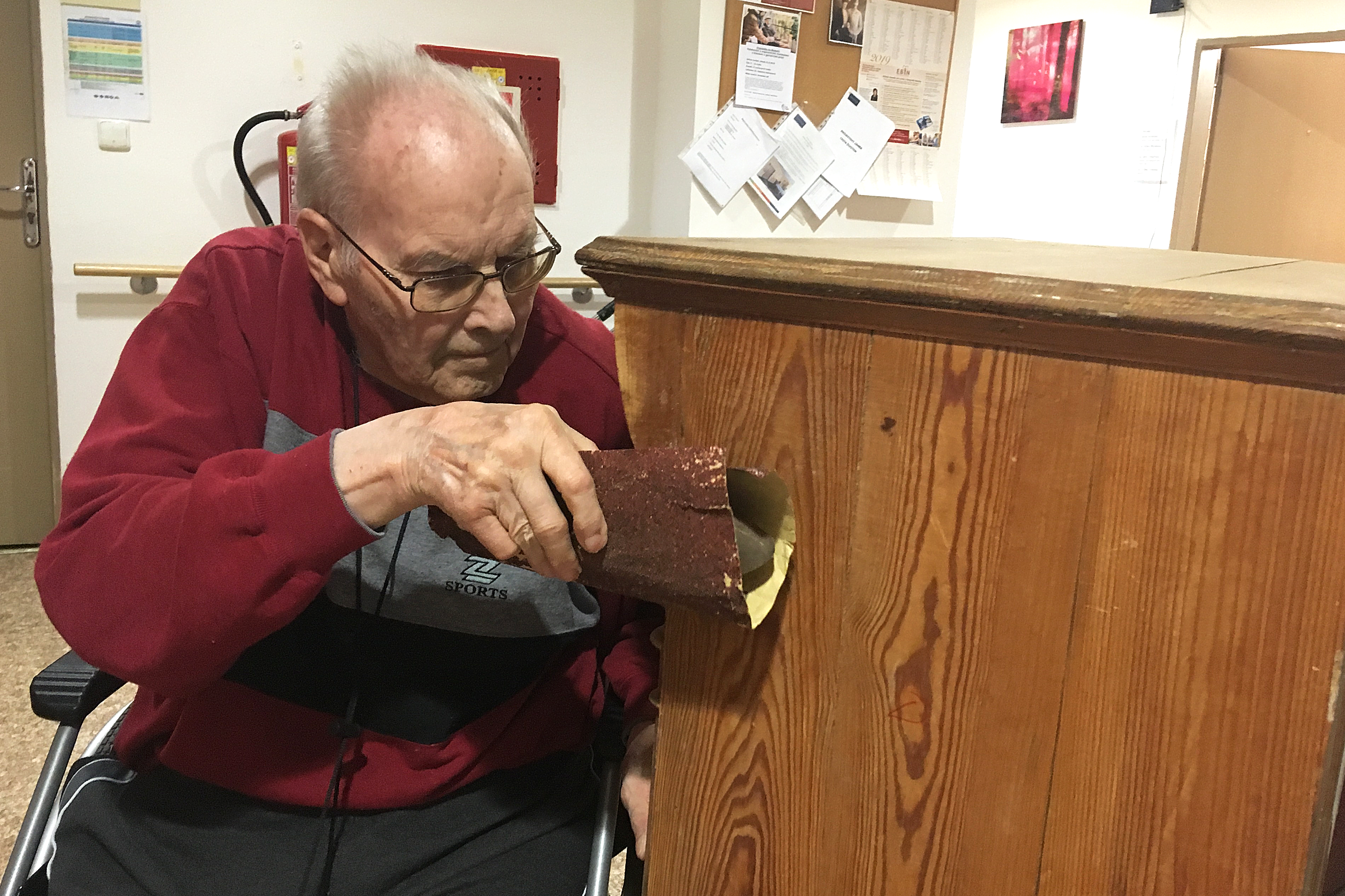 Třeba pan Josef. Pocit vlastní nepotřebnosti a neužitečnosti byl pro něho velmi frustrující. Ve svém aktivním pracovním období zastával pozici vedoucího truhlárny, miloval práci rukama, když mu pod nimi vznikalo nové dílo. S odchodem do důchodu a později do Domova Sue Ryder se každodenní rytmus změnil. Pan Josef, dříve velmi pracovitý muž, se začal cítit nevytížený, ba přímo zbytečný. Aktivizační programy v domově jej dokázaly rozptýlit, ale vždy jen na chvíli. Pořád to nebylo ono, a tak se členové pečujícího týmu domluvili, že najdou panu Josefovi „práci“, která mu opět udělá radost. V přízemí, v našem dobročinném obchodě, objevili krásnou starou komodu, jež vyžadovala nutnou dávku péče, než bude umístěna do jídelny na oddělení C. Toť úkol hodný pana Josefa!